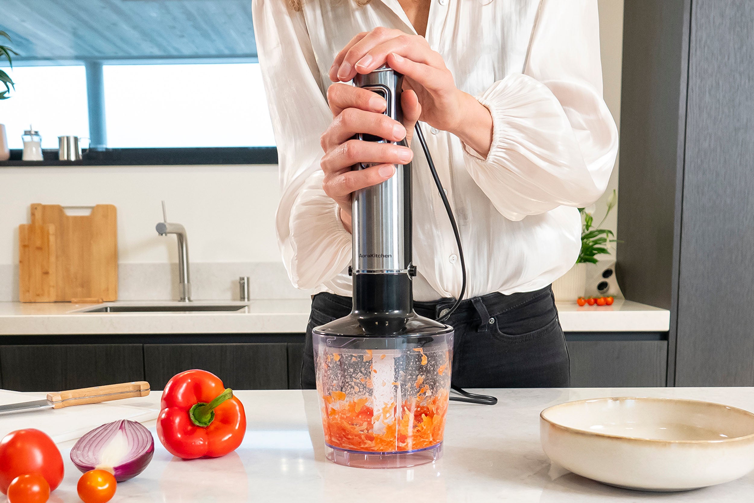 De hakmolen van de staafmixer set is ideaal voor snel en gelijkmatig hakken. Of het nu gaat om groenten, kruiden, noten of uien, met de scherpe messen en krachtige motor zijn je ingrediënten in een mum van tijd fijngehakt. Een onmisbaar hulpmiddel voor iedere keukenliefhebber!