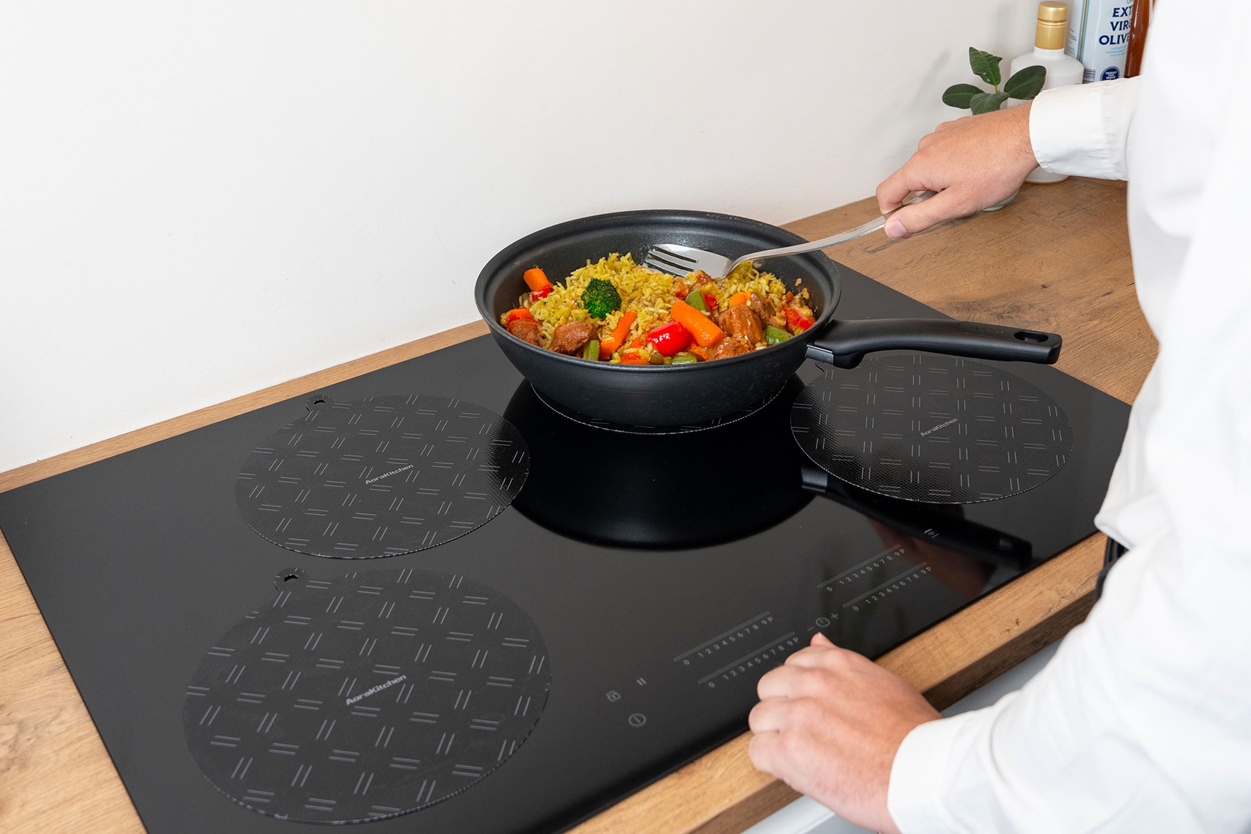 De inductiebeschermer biedt een veilige en stabiele basis voor je pannen tijdens het koken. Hij voorkomt krassen en beschadigingen op het kookoppervlak en zorgt voor een gelijkmatige warmteverdeling.